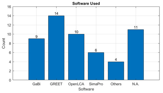 Figure 4 illustrates the primary software utilized for conducting an LCA in the selected articles, listed in order as GREET, OpenLCA, GaBi, and SimaPro. The ‘Others’ category encompasses software used to a lesser extent, and there are instances where studies do not specify the software employed. The documents in which the software used has not been specified have been grouped with the designation “not available” (N.A.).