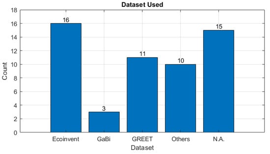 As for the databases used in conducting the LCA analysis, the Ecoinvent database, in its various versions, was predominantly employed in the articles, followed by the GREET and GaBi databases. The ‘Others’ category encompasses additional databases or datasets used to a lesser extent. Additionally, it includes articles that utilized other studies as datasets or obtained information through companies. In 15 articles, it was not possible to identify univocally the database used. Figure 5 presents a graph that illustrates the information discussed.
