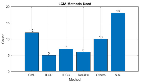Among the various LCIA methods, the most frequently employed in the selected articles are CML, IPCC, ReCiPe, and ILCD. Additionally, other methods, such as Traci and Eco-Indicator 99, were used. However, in 18 articles, it was challenging to clearly deduce the specific method used for the LCA analysis. Figure 6 illustrates the frequency of usage for each method.