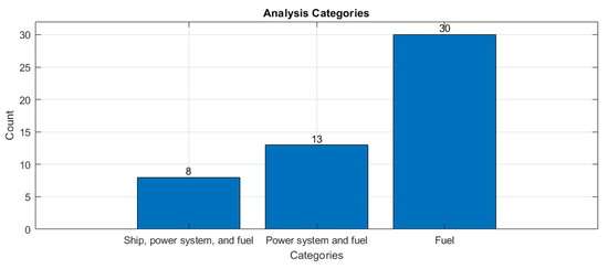 Irrespective of the investigated boundaries, certain articles analyze the entire ship, encompassing its structure and propulsion system (internal combustion engines, electric motors, etc.). Others focus on the propulsion system in conjunction with the fuel, while some exclusively analyze the propulsion system, excluding considerations of the fuel. Notably, the majority of the identified articles (30 over 51) solely examine the used fuel. This information is meticulously depicted in Figure 7.