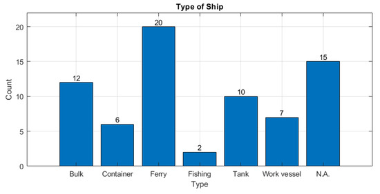 The articles investigated encompass a wide range of ship types. In this review, ships were categorized into five groups: bulk (including unspecified cargo ships), container, ferry (encompassing passenger transport ships, Ro-Ro, and Ro-Pax), fishing, tank (irrespective of the transported cargo type), and work vessel (encompassing tugs, frigates, dredgers, and others). Notably, 15 articles lacked explicit references to the investigated vessel type. Figure 8 provides a detailed breakdown of the frequency of various ship types in the identified articles.