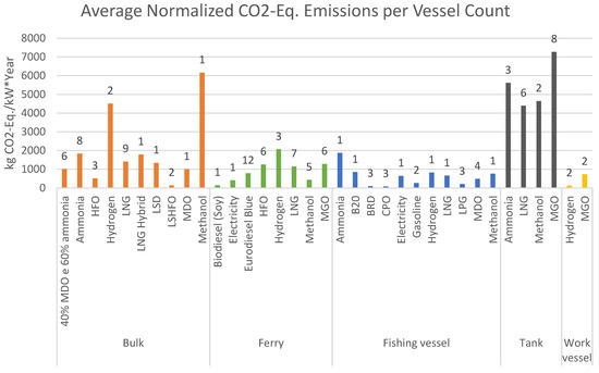In this section, the analysis of the 51 selected scientific articles is conducted, with the aim of presenting a comprehensive overview of the studies carried out in the field of LCA of maritime transport. Subsequently, the normalized outcomes of the papers are illustrated. The obtained data, resulting from the proposed methodology, provide a useful overview of the environmental performance of different types of fuel and ships. The data normalization makes it easier to perform a homogeneous comparison on an ecological level, offering a comparative view of the environmental impact.