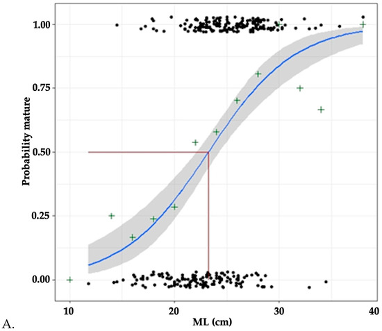 Growth was isometric (p > 0.05, R2 = 0.82) (Figure 4C); the asymptotic length (L∞) was 39.9 cm ML; the mean growth coefficient (K) was 0.83 y−1; and the growth performance index (φ’) was 3.12. The length at first capture (Lc) was 15.43 mm ML, the natural mortality (M) was 1.4 y−1, the fishing mortality (F) was 0.4 y−1, the total mortality was 1.8 y−1, and the exploitation rate (E) was 0.22.