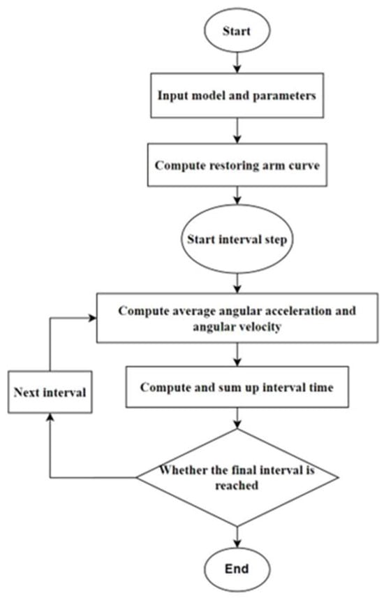 The static restoring time of a trial boat in the transformed variable method and in the experiment were used to verify the accuracy of the midpoint average method. According to the previous study [13], there were two conditions in the experiment and four working conditions in the transformed variable method. The only difference between these conditions was the gravity center height. Restoring arm curves on different conditions were shown in the previous study. Based on these curves, the static restoring time in the midpoint average method was computed via the procedure shown in Figure 1. In this procedure, roll angle nodes and their corresponding restoring arms were straightly measured from restoring arm curves in the previous study.