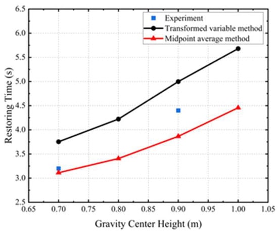 Based on data from restoring arm curves in the previous study, the results of the new midpoint average method were compared with the available experimental results [13] and transformed variable method results [13]. In these methods, gravity center height is measured from the bottom baseline of the boat. According to Equations (1) and (2), if the damping factor and wave-disturbing factor are ignored, the restoring time of the static condition should be shorter than that of the real sea condition because of larger angular acceleration. The results in Figure 2 and Table 1 show that the absolute value of comparison error of the new midpoint average method was lower than that of the transformed variable method, which indicates that the validation of the new midpoint average method was successful.