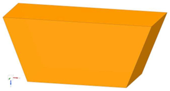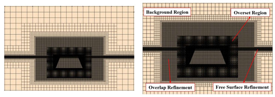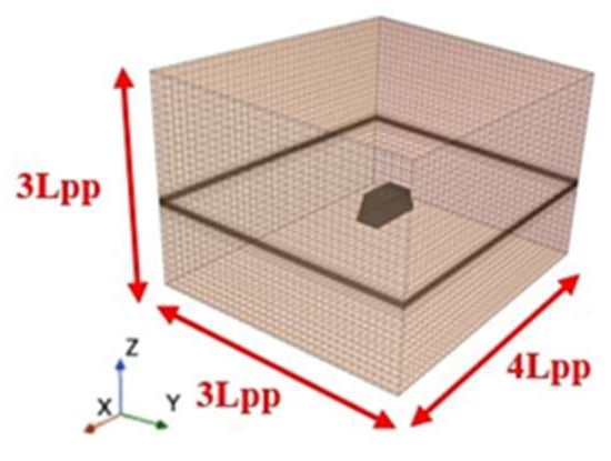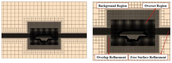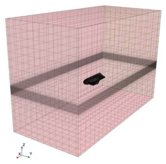 The computational domain is shown in Figure 7, which extends over the ranges of −2Lpp < x < 2Lpp, −Lpp < y < Lpp, −Lpp < z < 2Lpp. The origin point of the global coordinate was set in the center of the bottom of the trapezoid. The initial state of the physical model was inverted and completely immersed under the water surface to simulate extreme conditions after capsizing. Figure 8 shows two refinement regions: the overlap refinement region and the free surface refinement region. The overlap refinement is employed between the surface of the physical model and the background to ensure that the transition of these two regions is smooth. The size of the box for the overlap refinement is −0.3 m < x < 0.3 m, −0.2 m < y < 0.2 m, −0.26 m < z < 0.09 m, and this size covers the physical model height. For the free surface refinement, the size is −1.25 m < x < 1.25 m, −1.1 m < y < 1.1 m, −0.02 m < z < 0.02 m. The free surface refinement region is located near the water surface and used to distinguish the water phase and the air phase with high precision.