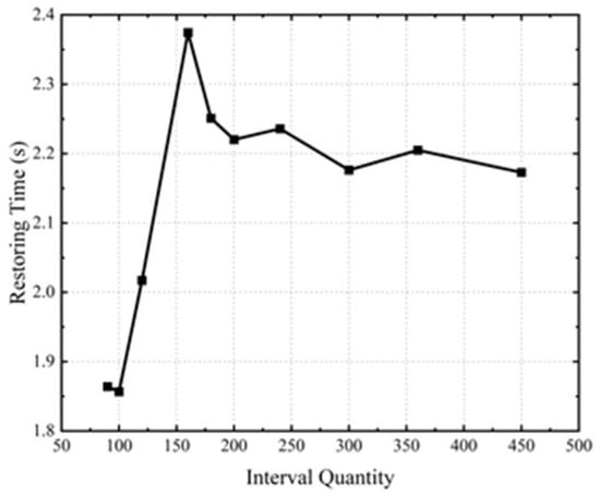 Figure 5 and Table 3 show the results of the interval quantity convergence analysis. The error between the result of 180 intervals and the result of 200 intervals is less than 1.3%, which means the accuracy of 180 intervals is enough. According to Equation (16) in the midpoint average method, the restoring time is 2.22 s. Figure 6 shows the result of the midpoint average method in the time domain. This restoring time result is to be the reference in the simulation.