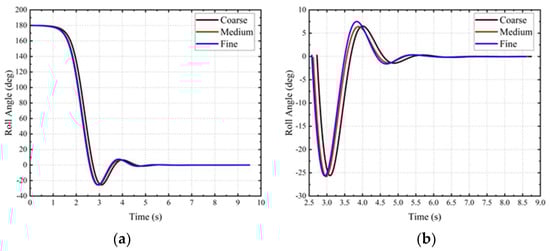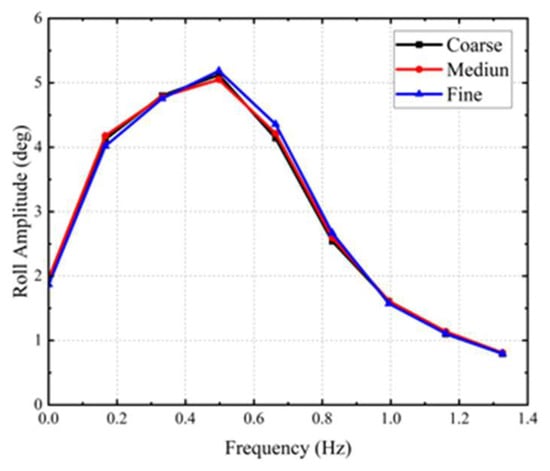 It is recommended that at least 100 time-steps per period are used for the periodic phenomena [25]. According to Equation (13) and Table 2, the natural roll period is 1.03 s, and the maximum time step based on the ITTC recommendation is 0.01 s. For time step convergence analysis, three types of time step are generated with the division ratio 2 for coarse (0.01 s), medium (0.005 s) and fine (0.0025 s). The total simulation time is 10 s, which contains at least four roll decay periods. The results of the angular velocity in upright position simulated via coarse, medium and fine time steps are summarized in Table 4. Considering computational accuracy and efficiency, the medium time step (0.005 s) was chosen.
