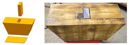 The self-righting experiment was performed to measure the restoring time under real conditions and validate the simulation result. The physical model is shown in Figure 12 and its main parameters are listed in Table 6. The main material of the model was wood because it is normal for boat models and it has enough intensity. There was a rectangular hole through the center of the model. The iron block was used to increase the draft in order to imitate the high-loaded working conditions. There was an iron sheet fixed in the bottom of the model. The iron sheet was used to decrease the gravity center height of the model in order to guarantee enough stability. To prevent water from penetrating the wood, there was a layer of wax wrapping the surface of the whole model.