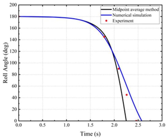 The restoring time in the experiment was 2.46 s, which is shown in Figure 14. Compared with the restoring time in the midpoint average method, the restoring time of the simulation and the restoring time of the experiment were longer. Damping factor and wave factor are ignored in the midpoint average method, so when they are at the same position, the total angular acceleration in the midpoint average method is larger than that in the simulation and in the experiment. Larger angular acceleration at the same roll angle means less time, so the static restoring time is less than the restoring times of the simulation and the experiment. Compared to the results of the midpoint average method, the simulation results had higher accuracy. The error of restoring time between the midpoint average method and the experiment was less than 10%. The error of restoring time between the simulation and the experiment was less than 5%. The simulation can be used to predict the self-righting process of the USV.