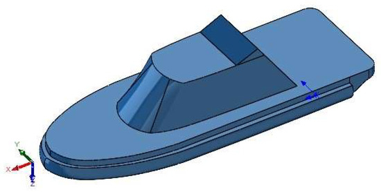 This USV was designed to execute rescue tasks and should have safe navigation ability under severe sea conditions. Parameters of the USV are listed in Table 8, and a simplified model is shown in Figure 15. There are four working conditions when the USV executes tasks: they are leaving port with the design load (condition 1), reaching port with the design load (condition 2), leaving port with maximum load (condition 3) and reaching port with maximum load (condition 4). The differences in the four working conditions can be simplified as differences in displacement and in gravity center position. The reference point is set at the backend of the bottom of the USV. The parameters of the four working conditions are listed in Table 9. The numerical simulation method above was used to predict the self-righting performance of the USV under four working conditions.