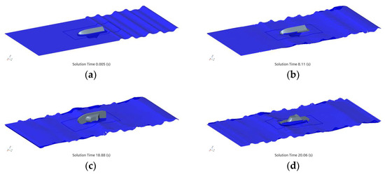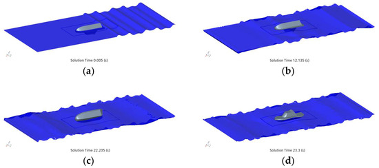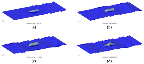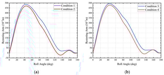 The displacement in condition 1 was smaller than that of condition 3, and the gravity center height of condition 1 was higher than that of condition 3. The displacement in condition 2 was smaller than that of condition 4, and the gravity center height of condition 2 was higher than that of condition 4. There were two factors which were different at the same time, and the influences of the two factors on self-righting performance were opposite. According to the restoring arm curves in Figure 18, the restoring arm is less than zero between 126.4° and 146° for condition 2, and the restoring arm is less than zero between 130° and 142.8° for condition 2. The restoring arm curves mean that, based on the static stability theory, the USV should not have the self-righting ability under condition 2 and condition 4. However, the simulation results shown in Figure 19, Figure 20, Figure 21 and Figure 22 prove the self-righting ability under four working conditions. The change of water surface shape makes the restoring arm in the simulation different from that of the static stability method, which will influence the restoring time. In terms of the restoring time shown in Table 10, the self-righting performance sorted from best to worse is as follows: condition 4, condition 3, condition 1 and condition 2.