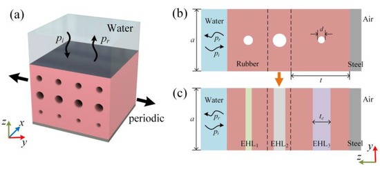 As a crucial scheme to shield the active sonar detection signal and to suppress the echo from hulls, anechoic coatings have significantly improved the comprehensive stealth performance of underwater vehicles [1,2,3]. The traditional layer was made of viscoelastic material as the host medium to match their surface impedance with the background, and sundry embedded cavities were introduced to improve the underwater absorption in low frequencies [4,5,6]. Such configuration enhanced the wave-type conversion from scattering waves inside coatings [7] as the incident wave approached the embedded voids’ resonant frequency. Thus, the energy dissipation in low frequencies occurred based on viscous friction, heat conduction, and the substrate relaxation [4,8]. At present, viscoelastic medium embedded with periodic voids is still the efficient type of anechoic coatings laid on vehicles. Among previous studies, an analytical solution based on the viscoelastic Kelvin–Voigt theory [1] was proposed, which accounted for the dispersion curves and attenuation of the axisymmetric viscoelastic waves in perforated neoprene [9,10]. Then, the effective medium approach (EMA) for the anechoic coatings embedded with penetrating voids was proposed based on the monopole resonance effect [6,9]. In such an artificial microstructure, the insulation bandwidth could be tuned precisely associated with the geometric parameters of the periodic voids [10].