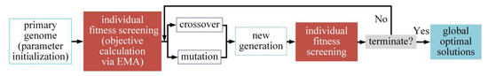 The absorption spectrum can be deduced from Equation (2) with the determined geometric and mechanical parameters of layers. In order to propose the underwater absorber suitable for the target low frequencies, a genetic algorithm (GA) in concert with the above method is utilized here. As an optimization algorithm inspired by biological evolution and natural selection, the flowchart of the GA is depicted in Figure 2. In the optimization, the crossover and mutation probability constant, population size, and maximum iteration generation were set as 0.2, 0.2, 100, and 10,000, respectively. Because the broadband absorption for sonar signals at low frequencies is important to improve the stealth performance of underwater vehicles, the tandem coating embedded with multilayer voids would be further designed via GA, so that the objective function is set as with the working frequency . Here, N is equal to the layer number of the tandem coating. The global optimized geometric parameters, including a, d, and t, can then be pinpointed when the termination condition is satisfied. The total number of variables to be optimized is 3*N. Note that and are set to guarantee the reality in geometry. In addition, should be included in the search-bounded constraints to ensure the resonant frequency limited in the EMA method [23]. In the GA optimization, there are two types of the termination conditions. One is reaching the maximum iteration generation. The other is solution convergence, which means no significant individual improvement over the past few generations. Here, the objective function is regarded as the screening criterion for individual fitness, as represented in Figure 2. We compare the current best fitness value with the mean fitness value from the past few generations, and if the difference is less than the threshold ( set in the algorithm), the solution is considered to be convergent. Based on this, we could come up with quasi-perfect waterborne absorbers pertinently on the low frequencies and broadband via compact sizes.