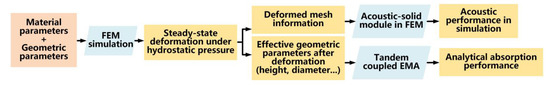 To mimic the affected absorption performance of the anechoic coating under hydrostatic pressures, the resonant voids’ deformation in the host medium will be analyzed in this paper, as follows. Figure 3 represents the flow chart for absorption performance estimation via hydrostatic pressure. The finite element simulation is performed to calculate the steady irregular deformation of the anechoic coating, in which the modeling details are shown in the Section 2.3. Then, we substitute the equivalent void diameters and coating thickness into the EMA solution to obtain the analytical absorption spectrum affected by the hydrostatic pressures. Note that the equivalent diameter of the cylindrical cavities after compression was calculated by converting the surface integral into a line integral based on Stokes formula . is the gradient operator, is a specific function, and l represents the boundary surface of the domain to be integrated. As for the cross-section of anechoic coating, the Stokes formula should be expressed as . Here, represents the surface integral of the cylindrical void section. and are the normal vectors on y- and z-coordinates in Figure 1b. refers to the curvilinear integral in the cross-section. Then, the equivalent diameter after compression could be expressed as .