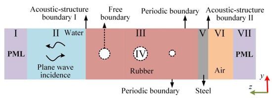 Numerical simulation is performed in this paper with the finite-element analysis software COMSOL Multiphysics. After calculating the nonlinear geometric deformation via hydrostatic pressures, the deformable mesh under hydrostatic pressures will be directly imported into the acoustic-structure coupling module in simulation, avoiding discontinuous double modeling. Since the voids embedded into the tandem coating in Figure 1 are arranged periodically and extend infinitely in the x-direction, we could simplify such a model into a two-dimensional lattice to improve computational efficiency. The boundary condition and material settings in each region are shown in Figure 4. The acoustic pressure domain is labeled at Region II, IV, and VI. III, V marks the solid part, and I, VII refer to the perfect matching layer (PML) to mimic the nonreflecting boundary. The viscoelastic module is applied to the rubber domain. Floquet periods are applied to the upper and lower rubber boundaries, and the free boundary condition is set around the embedded voids. The acoustic-structure coupling border is paved between the solid domain and the water (air). Hydrostatic pressures are quantified as the boundary load inflicted on the acoustic-structure boundary I, while the displacement in the y-direction of the periodic border, i.e., the radial removal of the coating, should be specified as . In addition, the displacement in both y- and z-directions should also be restricted as on acoustic-structure boundary II, which mimics the braced surface of the hull under hydrostatic pressures. The background pressure provides plane wave excitation existing in Region II. To solve the absorption coefficient numerically, we define the average operators in acoustic-structure boundaries I and II, from which the mean values for background and scattering pressure around the coating surfaces could be extracted.
