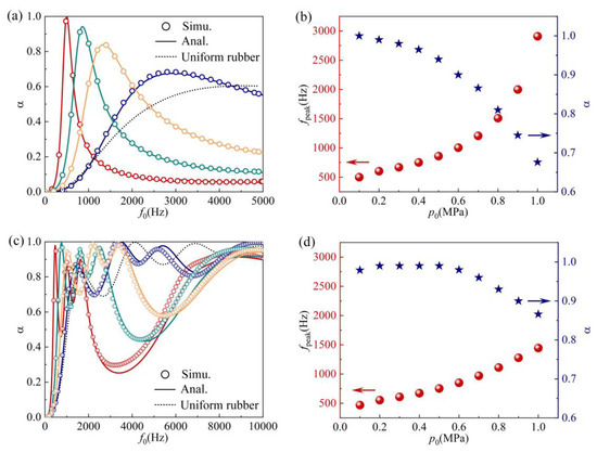 The absorption performance of the single-layer void-resonant coating is stated in Figure 5a. The analytical and numerical data are represented by the solid lines and circles, while the crimson, olive, orange, and blue data refer to the ordinary pressure, 0.5 MPa, 0.75 MPa, and 1 MPa, respectively. The black dotted line shows the absorption performance from the homogeneous rubber without voids. Due to the monopole resonance of the single-layer void array [2,23,31,32], the hump absorption will occur at 500 Hz under ordinary pressure (0.1 MPa). Affected absorption performance is shown in detail in Figure 5b; here, the red globes correspond to the located frequency of the first absorption crest value, while the navy blue pentagrams refer to the absorption amplitude. As hydrostatic pressure increases, it is obvious that the formant shifts to higher frequencies and the absorption peak declines. When neglecting the change of mechanical parameters under hydrostatic pressures, the analytical absorption coefficients are in good agreement with the numerical data. By analogy with the analysis for single-layer coating, the analytical and numerical absorption coefficients from the tandem coating are illustrated in Figure 5c. Benefiting from the increment of resonant modes and the coupling effect between multilayer voids [21,33,34], quasi-perfect absorption from 420 Hz to 1720 Hz could be approached via this compact broadband absorber under ordinary pressures. The three resonance peaks would skew toward the higher frequencies, accompanied by the reduced amplitude and broader bandwidth, as shown in Figure 5c,d, which enhances the absorption efficiency in the middle-frequency band (2.5~5 kHz) at 1 MPa.