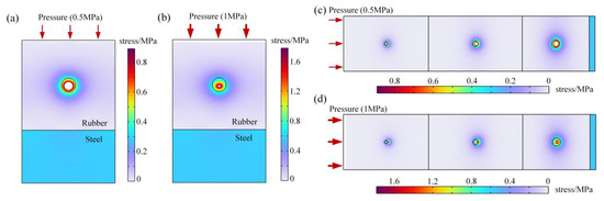 To clarify the affected mechanism via hydrostatic pressure, the stress distribution within the unit cell was performed in FE simulation as follows. Figure 6a,b represent the stress distribution of the single-layer coating at 0.5 MPa and 1 MPa. The black frame identifies the original outline under ordinary pressure. With the increase in hydrostatic pressure, the cross-section of the embedded void is squeezed into an irregular ellipse while the stress around the cavity increases significantly. The overall coating thickness decreases mildly at 1 MPa, which attributes to the reduction in the wave transmission path. Such compressed configuration would result in the altering of the resonance frequency and being close to the homogeneous medium, as represented by the black dotted line in Figure 5a. For the tandem anechoic coating, the deformed geometries consisting of multilayer voids are displayed in Figure 6c,d. The hydrostatic load perturbs the coupling effects between multilayer voids and changing the hump resonance at low frequencies. Therefore, the surface impedance originally adapted to the low-frequency incidence would fail and approach the performance of the uniform rubber without embedded voids. This provides an efficient approach to predict geometric deformation and the corresponding affected absorption performance via different hydrostatic pressures.