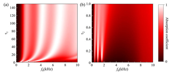 Following the previous research [7,35], the viscoelastic medium’s shear modulus determines the underwater absorption performance in low frequencies and broadband. Nevertheless, would be enlarged and significantly affected by external hydrostatic load, while the corresponding loss factor decreases slightly [36]. Such envelope is consistent with the knowledge that the viscoelastic medium would be “hardened” under hydrostatic pressures. Herein, to precisely predict the absorption performance of the anechoic coating in the engineering environment, it is necessary to analyze the influence of the dynamic mechanical parameters of rubber on the absorption coefficient. Note that the first Lame constant of rubber is not sensitive to the hydrostatic pressures [36], so the modification of longitudinal modulus under hydrostatic load was ignored in this work due to in elastically soft medium [23]. Figure 7 illustrates the complex plane diagram [37] for the absorption spectrum from the tandem coating in Table 3, where and refer to the scaling factors of the real and imaginary parts of the shear modulus, respectively. A light-colored region means the tandem coating achieves quasi-perfect absorption at the specific frequency band when possessing the corresponding shear modulus. The absorption efficiency in low frequencies will be limited as the real part of shear modulus increases, while the hump absorption is inclined to higher frequencies and the quasi-perfect absorption bandwidth is widened. In addition, each resonance hump’s bandwidth at low frequencies becomes constrictive when the shear loss factor . In other words, the variation of mechanical parameters via external hydrostatic load would also contribute to the disabled coating immediately, whose surface impedance had been precisely engineered to match the target frequencies under ordinary pressure. Above all, from the perspective of engineering applications, if the anechoic coating is just required to maintain impedance matching with the specific frequency band at the ordinary pressure, the anticipative absorption performance would not be approached under deeply submerged distances.