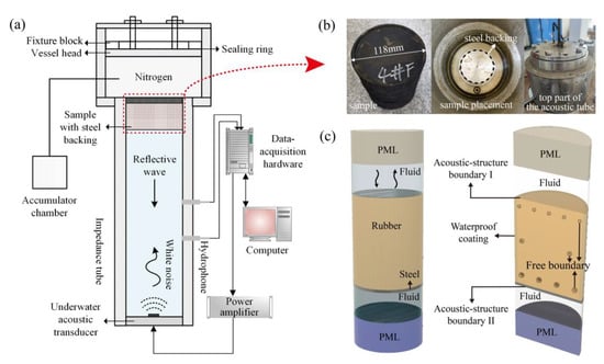 In this section, we conduct the experiment in an impedance tube filled with water to demonstrate the absorption dependence around hydrostatic pressures. Note that the tandem coating adopted in the investigation here was constructed with different void periods in each layer (Table 4) to improve the coupling effect between themselves [21]. Because a viscoelastic medium with arbitrary mechanical parameters is difficult to prepare in engineering, and for the sake of the manufacturing reliability for raw material, polyurethane (PU) was chosen for the host medium of a specimen. The longitudinal modulus and shear modulus of PU were measured by the dynamic thermomechanical analysis (TA Instrument Co., Ltd., New Castle, DE, USA, DMA 850), as , and the static density . The properties of the elastic medium are assumed to be independent of the frequency. An experimental setup for underwater absorption measurement under hydrostatic pressures is shown in Figure 8a, which is composed of a hydroacoustic tube, pressurization system, sealing device, signal generation, and measurement system. The inner diameter of the pipe is 120 mm, corresponding to the reasonable measuring frequency band 500 Hz~10 kHz. As for the nitrogen pressurizing device, an accumulator chamber could precisely control the hydrostatic pressure loaded on the sample surface. The sealing device on the top part of the acoustic tube includes the sealing ring, vessel head structure, and fixture blocks. The acoustic specimen is assembled from PU embedded with multilayer voids and steel backing (Figure 8b,c), fed with sound waves generated by a transducer controlled by the power amplifier. Pressure signals are collected by the hydrophones , amplified, and sent to the data-acquisition hardware. Then, we can obtain the complex reflection coefficient and the absorption efficiency from the specimen surface.