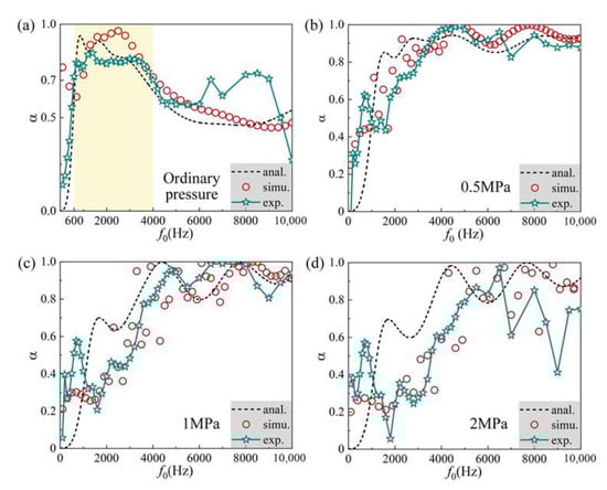 Comparison of sound absorption coefficients of the coating sample under ordinary pressure (a), 0.5 MPa (b), 1 MPa (c), and 2 MPa (d). Black dotted curves, red circles, and olive pentagrams refer to the data from the analytical solutions, simulation, and experimental results. The faint yellow region in (a) refers to the quasi-perfect absorption in low frequencies at ordinary pressure.