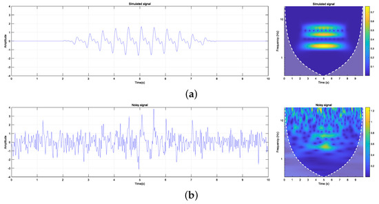 where, , k = 1, 2, 3, represent the order of the harmonics. Gaussian white noise was added to the simulated clean signal (Figure 3a) to generate a noisy signal (Figure 3b) with SNR of −5 dB, and the time series and CWT time-frequency plots are shown in Figure 3.