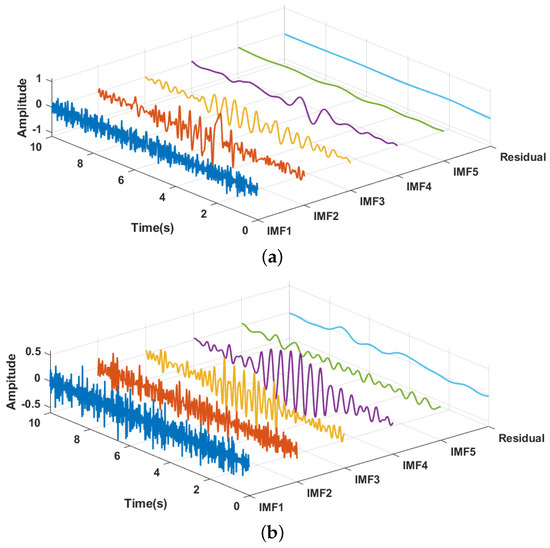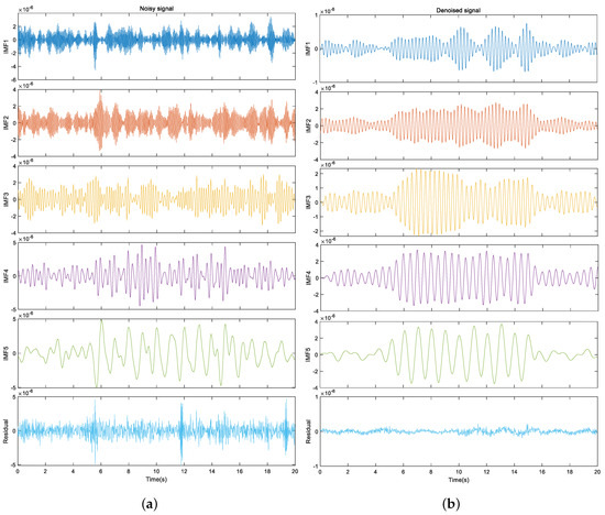 Modal components after VMD decomposition: (a) Noisy signal. (b) Denoised signal.