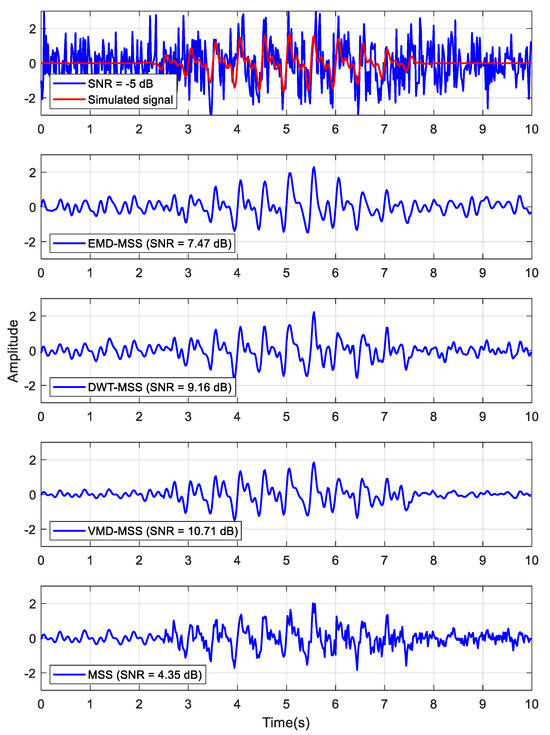 - In comparison to EMD-MSS, DWT-MSS, and MSS, the VMD-MSS method exhibits SNR and lower RMSE in both simulated and experimental signal processing results. Particularly in low SNR scenarios, the noise reduction effectiveness of VMD-MSS is notably pronounced.