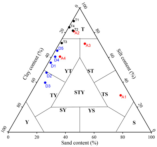 Shepard ternary diagram of sediment types in the experimental area. Red and blue dots represent particle composition at stations on sections AB and CD, respectively. The diagram also includes the percentage of sediment particle fractions at four stations in the West Pacific Ocean (black dots, data from Wang et al. [15]).