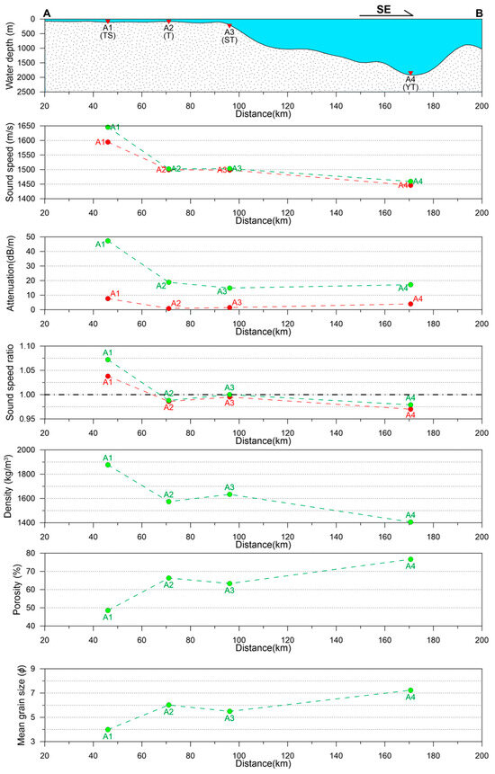 Variation of sediment acoustic and physical properties along section AB (NW-SE direction). Red dots represent acoustic properties measured using the in situ technique, and green dots represent acoustic and physical properties of sediment samples measured in the laboratory. The black dash-dotted line (SSR = 1) indicates that the sediment sound speed is equal to the overlying seawater sound speed.