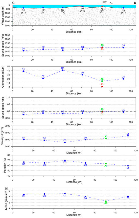 Variation of sediment acoustic and physical properties along section CD (SW-NE direction). Red dots represent acoustic properties measured using the in situ technique, and green and blue dots represent acoustic and physical properties of sediment samples measured in the laboratory. The black dash-dotted line (SSR = 1) indicates that the sediment sound speed is equal to the overlying seawater sound speed.
