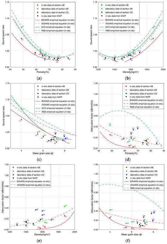 The variation trends of acoustic and physical properties along two sections (see Figure 4 and Figure 5) demonstrates a strong correlation between them. Previous researches had established empirical equations linking these properties, enabling the prediction of acoustic properties from physical properties and vice versa [3,17,37,43,44]. While early equations were derived from laboratory data, recent studies have introduced empirical equations based on in situ measurements, which generally align in terms of trends, with some discrepancies existing [3,17].