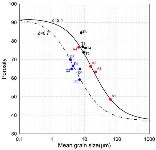 Relationship between measured porosity and MGZ (dots in different colors), with comparison to theoretical curves (solid and dotted lines) calculated from Equation (17) of Buckingham [45]. Note the difference of Δ (rms roughness) taken for the two curves.