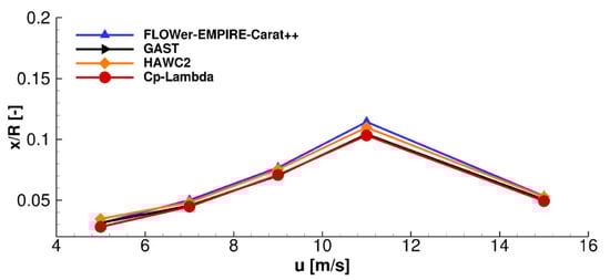 Normalized flapwise deformation at the blade tip for different wind speeds [27].