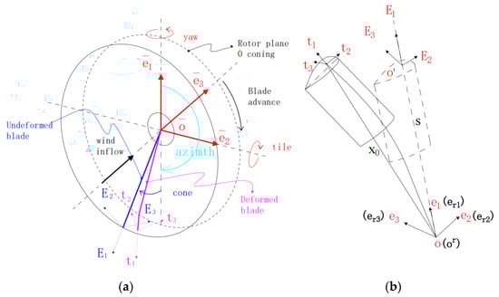 (a) Wind turbine coordinate systems [24]. (b) Initial and deformed configurations of the GEB.