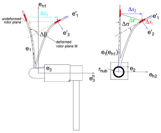 Due to the flapwise deformation of the blade, the deformed rotor plane, plane II, deviates from the ideally formed rotor plane, which is formed by straight blade sweeping. This deviation angle is equivalent to the blade cone angle, , which was corrected by introducing the flapwise rotation angle obtained from the structural model. Consequently, the pre-bend angle at this point on the deformed rotor plane was adjusted to . Within plane II, because of the edgewise vibrational deformation of the blade, the blade element also changes in the tangential direction. This change is equivalent to the sweep angle of the blade . The variable was introduced as a correction for this effect; it changes the blade sweep angle to . The transformation between the deformed rotor frame and the hub frame can be expressed by Equation (16):