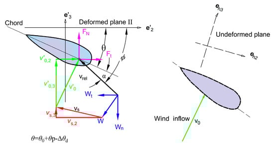 Figure 4 shows that in the deformed rotor plane frame, the second and third components of were considered, while the first component, which is in the radial direction, was neglected. Thus, the airflow velocity relative to the blade element was decomposed into normal and tangential components in the deformed rotor frame. The magnitudes of these components can be calculated using Equation (22):