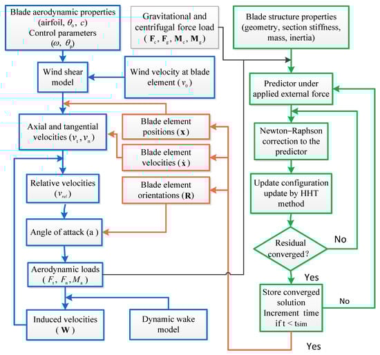 In time domain wind turbine simulations, prevalent coupling methods include both strong and weak coupling, which are also referred to as tight and loose coupling, respectively. Tight coupling demands strict adherence to conservation conditions between the fluid and structural domains, which necessitates continuous iteration and results in significant increases in computational costs. Research findings have indicated that the effects of using loose coupling rather than tight coupling for aeroelastic simulations are minimal and that loose coupling can meet computational cost requirements [22]. Notably, Sayed et al. (2019) [18], Sabale and Gopal (2019) [24], and Panteli et al. (2022) [25] all employed the loose coupling method. During this study, a loose coupling approach was adopted for the aeroelastic simulations, in which the structural response calculated during the preceding time step (which consists of the blade vibration velocity, the blade deformation, and the position) serves as the input for the load calculations performed in the subsequent time step. The external loads for the current step are computed using parameters from the previous step, which are assumed to remain constant during the structural dynamic response calculation iterations within the current time step. Figure 5 provides a flowchart of the aeroelastic coupling algorithm, in which the GEB model is utilized to calculate the blade structural response. When the Euler beam model is selected for calculation of the structural response, only the green portion of the flowchart must be replaced with a generic Euler beam solver.