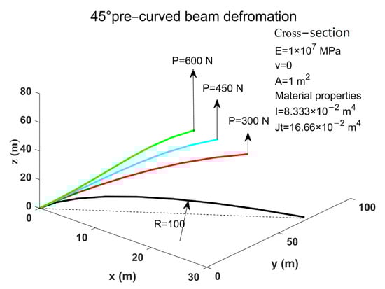A 45° pre-curved beam, which is characterized by substantial deformations and torsional nonlinearity, is frequently utilized as a benchmark to validate nonlinear structural models. Various wind turbine simulation tools have also employed this type of beam for computational validations [25,40]. To validate the GEB model developed during this study, the model was used to calculate the deformation of a 45° pre-curved beam when a steady load was applied on the free end of the beam. The geometric and material characteristics of the beam are provided in Figure 6, and the beam was discretized into eight beam elements. Steady loads of 300 N, 450 N, and 600 N were individually applied at the free end of the beam in the positive z-direction. A comparison of the position of the free end of the beam with other published results [31,34] is presented in Table 1. The results are highly consistent and therefore confirm the accuracy and reliability of the structural model developed during this study, which utilized the same internal force derivation method for the beam elements as did Cardona and Geradin (1988) [33]. Additionally, an analysis of the results revealed that, due to geometric nonlinearity, rotations around the x- and z-axes occur at the end of the beam along with rotation around the y-axis. The rotation vectors for the cross-section are presented in the fourth column of Table 1. In contrast, the linear Euler beam model could only calculate the rotation around the y-axis and was unable to capture the geometric nonlinearity.