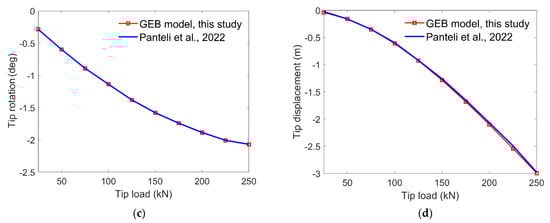 The results, which are presented in Figure 7, demonstrate a strong agreement between the GEB model established during this study and hGAST software [25], which confirms the reliability and accuracy of the GEB model when it is used to analyze nonlinear beams with varying cross-sections. Figure 7a shows that the flapwise deformation is minimal when a small static load is applied at the blade tip and that Euler beam model results align with the GEB model results. As the load increases, significant deviations arise between the Euler beam and GEB model results. This deviation reaches 16% for a 250 kN blade tip load, thereby revealing the inability of the Euler beam model, which is based on the assumption of small linear deformations, to accurately represent the substantial blade deformations that exist in this scenario. Due to the aerodynamic twist and irregular cross-sections within the blades, bend–bend coupling motion arises in the flapwise and edgewise directions. The non-coincidence of the aerodynamic center, centroid, and shear center of the blade cross-section introduces a bending–torsion coupling effect, which results in blade deformations that are characterized by a coupled flexural and torsional response due to external loads. Figure 7b demonstrates that because of the existence of bend–bend coupling, displacement also occurs in the edgewise direction. Figure 7c shows that for a 250 kN static load, substantial torsional rotation occurs at the blade tip because of bend–twist coupling; this rotation reaches a maximum of 2.1°. Simultaneous displacement in the flapwise direction and negative displacement in the longitudinal direction cause the blade to shorten, as illustrated in Figure 7d. The linear Euler beam model, which is constrained by theoretical limits and the small deformation assumption, failed to capture the bend–bend and bend–twist coupling effects, and its small deformation assumption precluded the simulation of longitudinal displacement; thus, no Euler beam results could be included in Figure 7b–d.