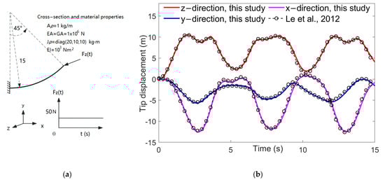 (a) Loading and being of the 45° pre-curved cantilever beam [41] and (b) beam free end time–history responses compared with reference [41].