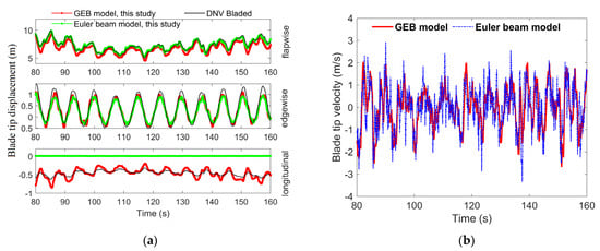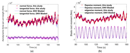 To validate the aerodynamic and load calculation models established during this study, simulations were conducted for the 10 MW RWT using the proposed model. The simulation results were then compared with those obtained from DNV Bladed software [42] (version 4.3, which uses Timoshenko beam elements for structural modeling and the BEM method for aerodynamic modeling). This is a widely recognized wind turbine simulation software endorsed by many international wind turbine certification authorities. The simulations, which included no corrections to the BEM model, neglected the blade vibration effects on the inflow wind speed, thereby essentially treating the blade as rigid. A three-dimensional turbulent wind field with an average wind speed of 11.4 m/s and a turbulence intensity of 20%, which considered wind shear and a ground roughness coefficient, , of 0.2, was generated by DNV Bladed. Yaw misalignment and wind turbine faults were not considered. Initially, aerodynamic loads per unit length, and , were extracted for comparison at 0.8 from the rotor center, which is the primary power-producing region of the wind turbine blade. The results were compared over a 100 s interval, as shown in Figure 9a, for clarity. The comparison revealed excellent agreement between the aerodynamic load calculation results obtained during this study and those generated by DNV Bladed. Minor discrepancies were observed, and these were attributed to differences between the correction methods for large axial induction factors, a, applied in this study and DNV Bladed [42]. To further validate the capability of the aeroelastic model to compute the overall blade loads, flapwise and edgewise root moments obtained from the model for the same simulation conditions were compared with those from DNV Bladed. The comparison, which is illustrated in Figure 9b, demonstrates strong consistency between the results from this model and those from DNV Bladed. Minimal differences can be observed in the edgewise direction, and any slight variations in the flapwise direction were primarily attributed to differences between the correction methods for large axial induction factors in the BEM model.