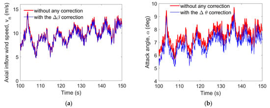 In Equation (18), represents the blade vibration speed vector, while the second term represents the velocity induced by the torsional blade vibration. Additionally, denotes the position vector of the aerodynamic center of the blade relative to the torsional center and represents the angular velocity of the torsional blade vibration. The position vector of the blade element, , is given by the structural model. The location change in the blade element caused by the blade vibration at s is denoted as (when neglecting the blade location correction, ). The position vector in the hub frame is expressed by , where is the hub radius. Utilizing the rotor rotation vector, ω, the relative velocity of the wind at s caused by the turbine blade rotation can be determined (in the hub coordinate system):