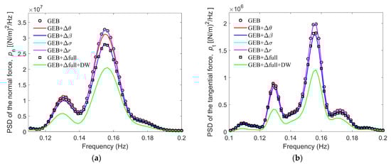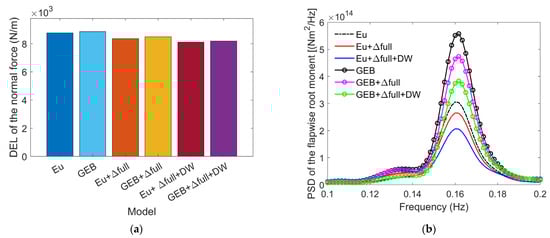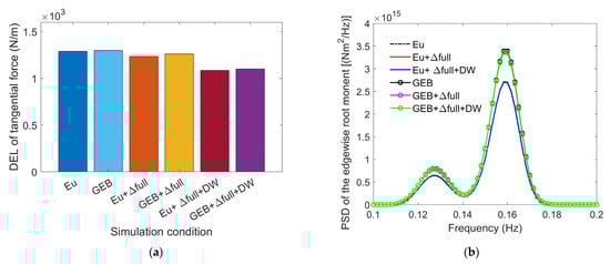 It is evident from the analysis presented in Section 3.5 that the linear Euler beam model overestimates the blade deformations and vibration velocity. The further analyses discussed in Section 3.6 revealed that the flapwise and torsional blade deformations, along with the dynamic wake, significantly impact the blade aerodynamic loads. The factors that affect the blade aeroelastic loads are diverse, thereby rendering the situation complex. This section presents an analysis of the influence of structural nonlinearity on blade loads by contrasting the simulation results for the Euler beam model with those for the GEB model. To enhance the computational efficiency, six models were selectively employed as follows: the Eu, (Eu + Δfull), (Eu + Δfull + DW), GEB, (GEB + Δfull), and (GEB + Δfull + DW) models. Previous analyses indicated that blade deformation most significantly affects the flapwise loads. Therefore, the DELs of the normal aerodynamic loads, , at 0.8 and the PSDs of the flapwise root moments calculated by the six models for the 10 MW RWT blade under turbulent wind conditions with a mean wind speed of 11.4 m/s for a duration of 600 s were initially compared, as depicted in Figure 17. Subsequently, the DELs of the tangential aerodynamic loads, , and the PSDs of the edgewise root moments calculated by the six models were also compared, and these results are presented in Figure 18.