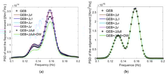 Figure 13 presents comparisons of the PSDs of the root moments calculated by the seven models for a mean wind speed of 11.4 m/s. As for the aerodynamic loads, the dynamic wake effect significantly reduces the flapwise loads at the blade root. However, its impacts on the edgewise root loads are relatively minor, as shown in Figure 13b. With respect to the effects of the different deformations on the root loads, the flapwise rotation deformation exerts the most significant influence, followed by the torsional deformation. The other deformations only minimally affect the flapwise root loads, as shown in Figure 13a. All the deformation corrections exhibit minor impacts on the edgewise root moment because the flapwise loads primarily result from the aerodynamic forces, while the edgewise loads are primarily influenced by the gravitational forces.