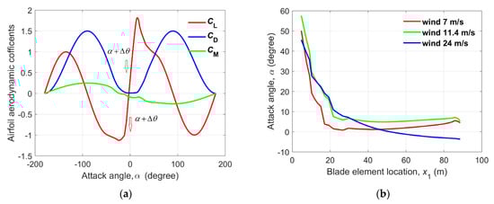 To compare the blade deformation effects at different wind speeds, spectral analyses were conducted for the aerodynamic loads at 0.8 under turbulent wind conditions with average wind speeds of 7 m/s and 24 m/s, as shown in Figure 14. Comparisons of the PSDs of the normal aerodynamic force, , at (as depicted in Figure 11a and Figure 13a,b) reveal that has the most significant impact on the blade aerodynamic loads at low wind speeds, while has the greatest influence at high wind speeds. This result is primarily caused by the torsional vibration of the blade, which gradually increases with the wind speed due to the geometric coupling effect. In contrast, the flapwise deformation of the blade reaches its maximum value at the rated wind speed and then decreases as the wind speed increases. The impact of the blade torsional deformation on the aerodynamic loads also gradually intensifies as the wind speed increases. The torsional deformation weakens the loads at low wind speeds, while at high wind speeds, it enhances them. The primary reasons for this phenomenon are presented next. When the radius exceeds 41.72 m, the FFA-W3-241 airfoil is used for the blade. The aerodynamic data for this airfoil are presented in Figure 15a. Figure 15b shows that, when the wind speed at the blade is 24 m/s, the FFA-W3-241 airfoil operates in the negative attack angle range. The introduction of the torsional deformation correction (which causes the blade to rotate toward the feathering direction) results in a negative twist deformation angle, . According to Equation (24), a negative twist deformation angle leads to decreases in the attack angle, α. As α continues to grow in the negative direction, as shown in Figure 15a, Cl and Cd increase; additionally, according to Equation (25), the resultant force, FN, also increases. Since the blade elements in this location represent the primary power-production region of the blade, the blade flapwise loads ultimately increase as well. This situation is exactly opposite to that when the blade operates at low wind speeds. For low wind speeds, the attack angle of the main part of the blade is positive; thus, the torsional deformation correction reduces the attack angle, which consequently reduces the resultant aerodynamic force and, therefore, reduces the loads.