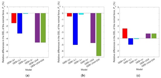 Fatigue analyses were conducted for the 600 s simulation effective results of the normal load, , at 0.8 generated by the seven simulation models with average wind speeds of 7 m/s, 11.4 m/s, and 24 m/s. To facilitate the comparison, the results from the GE model were used as a baseline. The relative differences in the DEL values of the baseline results and those calculated by the other six models are presented in Figure 16. It is evident from Figure 16 that the flapwise rotation and torsional angle corrections most significantly influence the aerodynamic fatigue loads, while the edgewise rotation angle and the blade element location change have relatively minor impacts. The dynamic wake correction has a smaller impact on the blade fatigue loads when the deformations are minimal, but it becomes more pronounced as the deformations increase. Blade deformations result in decreases in the fatigue loads at low wind speeds but increases at high wind speeds; these results provide further validation for the conclusions presented previously in this section.