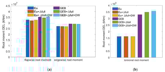 The DELs of the flapwise, edgewise, and torsional blade root moments calculated by the six different models are depicted in Figure 19. For a clearer comparison, the simulation results obtained from the GEB model were used as a reference. The results from the other five models were compared with these reference results, and the relative deviations are presented in Table 2. Furthermore, the relative deviations between the Eu + Δfull + DW and GEB + Δfull + DW models are also presented in Table 2.