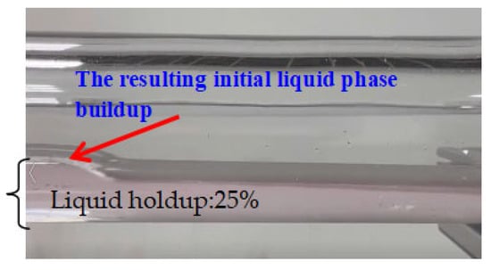 The experiment employed a waterproof adhesive to seal both sides of the pipeline instead of flanges, facilitating the operation of an adjustable speed servo motor for pig pulling and simulating pigging work. The pig was connected to a thin wire via the waterproof adhesive. This approach eliminated the need for flange drilling, simplifying installation and enabling precise control over pig speed, thereby achieving a more realistic flow field velocity. The primary objective of this experiment was to observe gas–liquid-phase velocity fluctuations during the pigging process in the pipeline. Figure 4 illustrates liquid holdup in the pipeline, Figure 5 shows the position of the pig in the pipe, while Figure 6 depicts the experimental test area captured, with specific test conditions detailed in Table 2.