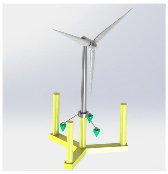 In addition, attaching Wavestar WECs in an array around a semi-submersible platform is another effective way to implement the concept of the floating wind–wave combined power generation equipment []. Gaspar et al. [] and Kamarlouei et al. [] studied the FOWT, connecting a concentric array of WECs, by using experimental methods. Other researchers [,,] have followed this idea by combining the Wavestar WEC with the DeepCwind platform, and the main purpose of the above-mentioned concepts is to generate more electricity rather than to be anti-pitching.